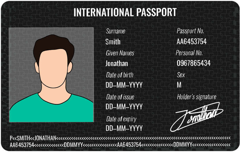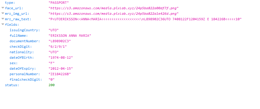 We'll start by scanning a government issued, travel document such as Passport, Visa or ID card from various countries using the DOCSCAN API endpoint. Besides its highly accurate text scanning capability, DOCSCAN should also extract (i.e. crop) any detected face within the target document. A typical input passport specimen and the scanned output fields should look like the following after processing: